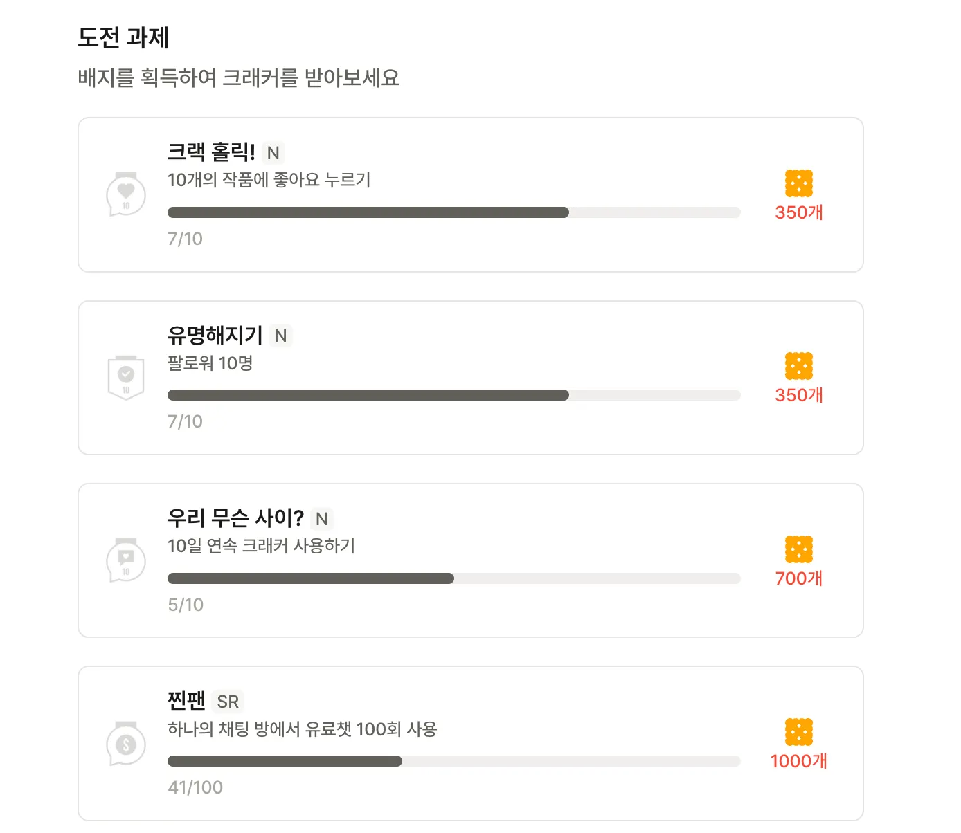 도전 과제를 달성하면 달성 배지와 크래커 보상을 받을 수 있어요.