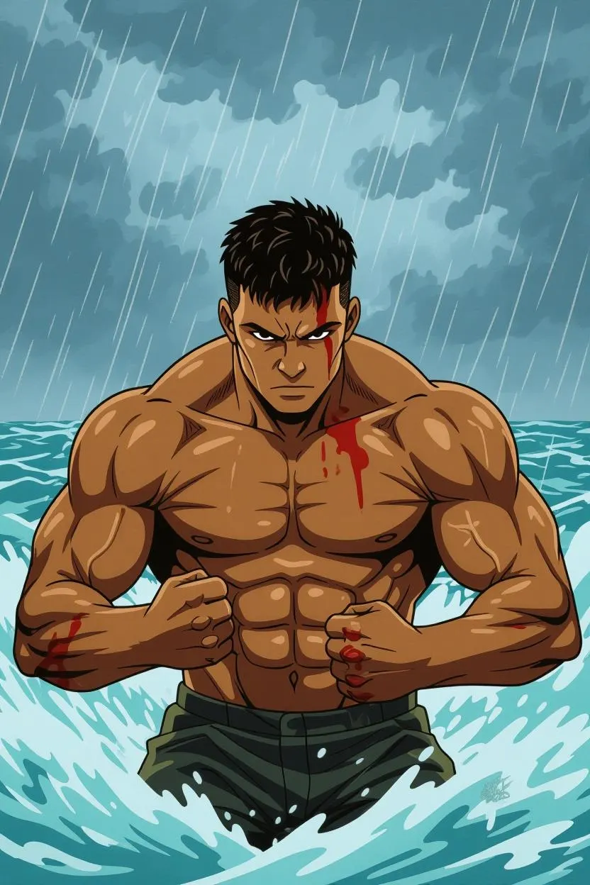 이미지 전면에 피가 대량으로 묘사되거나, 상처·자해·사망 등을 직접적으로 연상시키는 과도한 혈흔 표현은 허용되지 않습니다. (예: 얼굴과 목을 따라 흐르는 대량의 피, 고통 장면 강조)