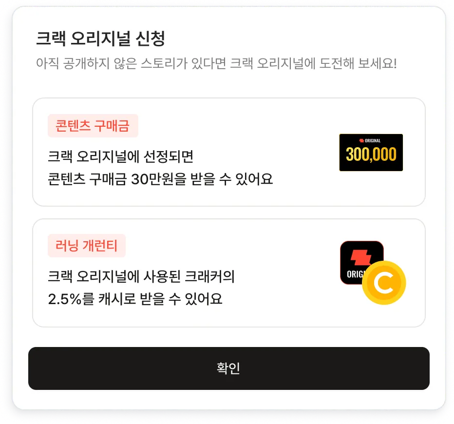 크랙 오리지널 작품이 되면 크랙과 정식 계약을 맺고 현금 수익과 전용 혜택을 받아보실 수 있습니다.