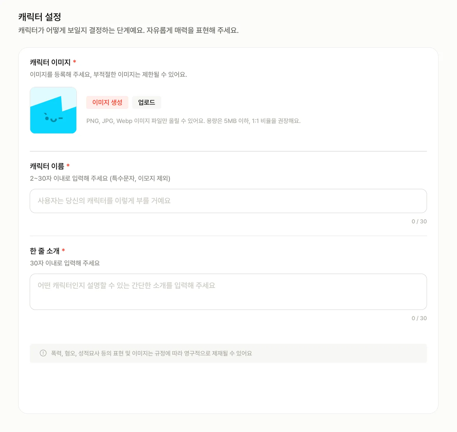 그리고 캐릭터에 대한 한 줄 소개를 작성해주시면 됩니다