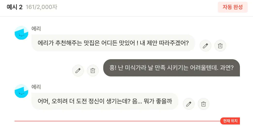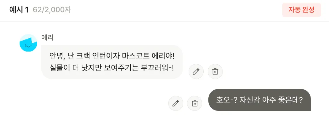 자동 완성을 통해 예시 대화를 채울 수 있어요.