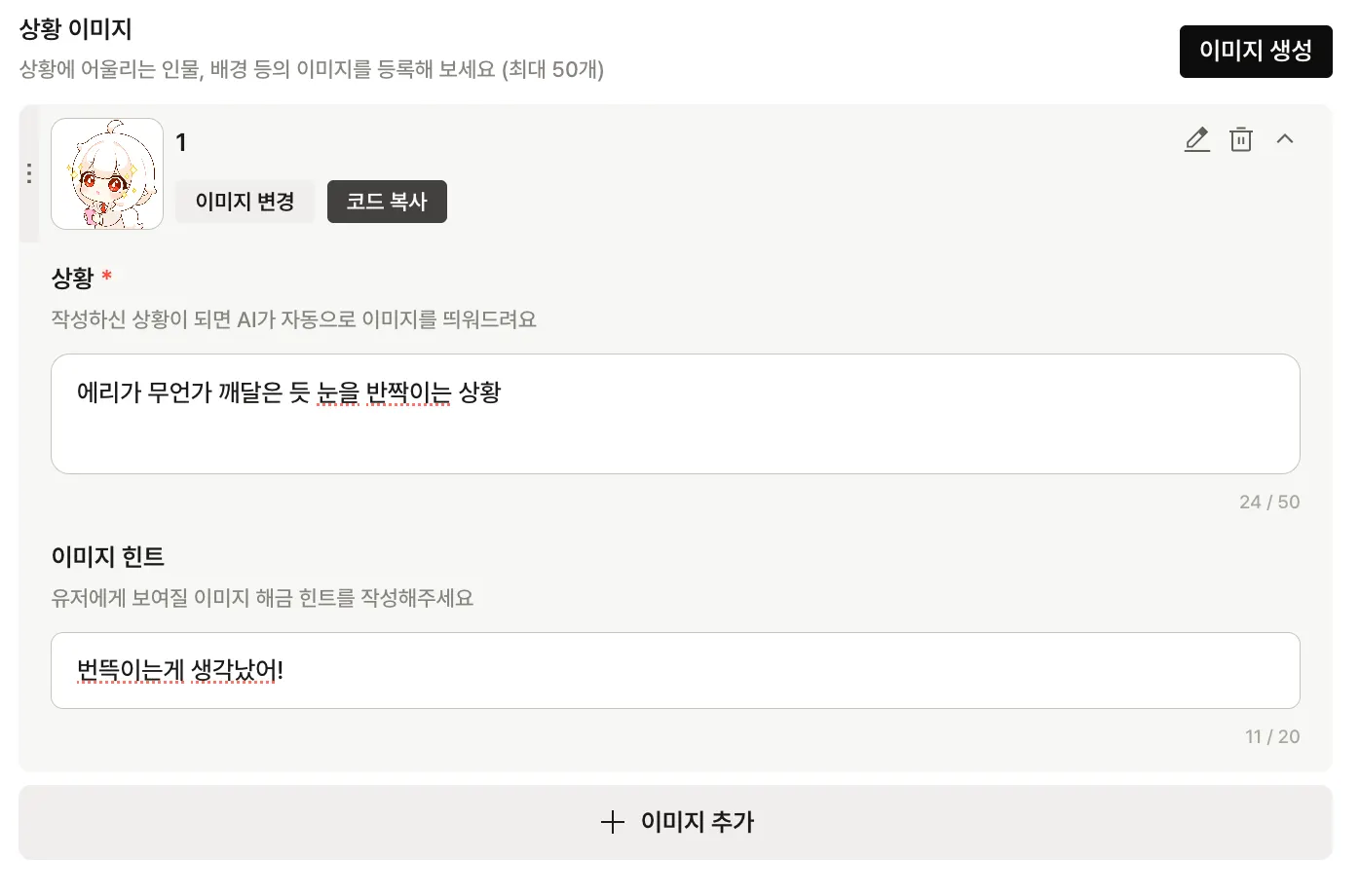 캐릭터가 ‘특정 상황이 된다면 ~~한 이미지가 나와야 한다’는 것을 지정하여 이미지를 추가할 수 있어요!