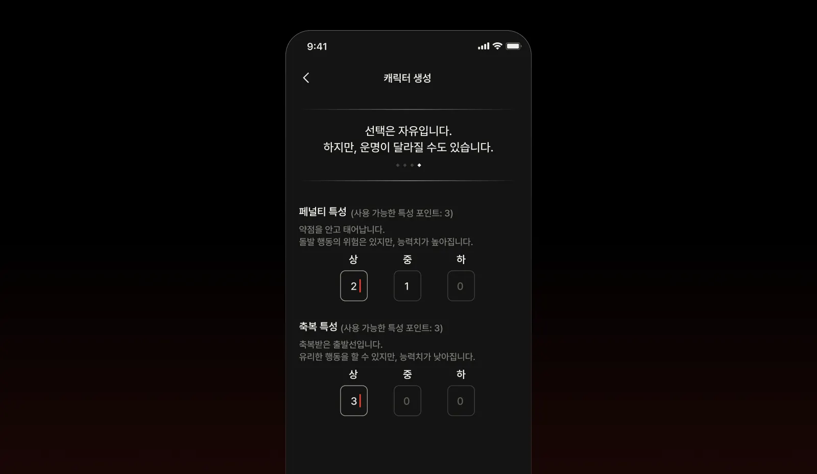 주어진 3 포인트를 투자해 필멸자의 운명을 결정하세요.
