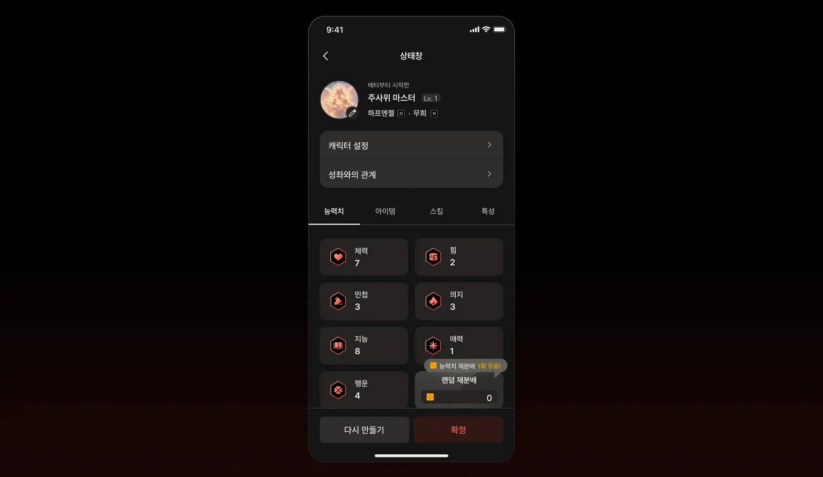만약 그의 능력치가 마음에 들지 않는다면 재분배할 수 있고, 새로운 필멸자를 찾아 처음으로 돌아갈 수도 있습니다.