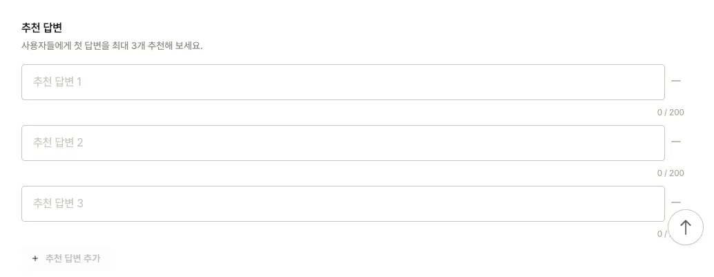 추천 답변을 지정하지 않는다면 AI가 자동으로 생성하고, 직접 개수를 조정하거나 최대 3개까지 추천 답변을 지정할 수 있어요