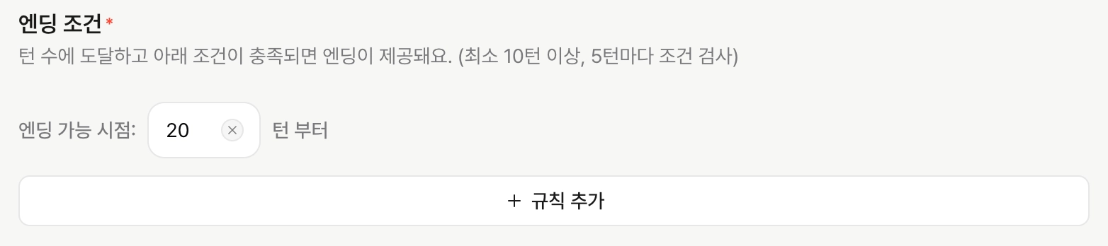 세부 조건(선택): 스탯이 설정되어 있다면, 스탯을 기반으로 규칙을 조합하여 더 구체적인 엔딩 도달 조건을 구성할 수 있어요