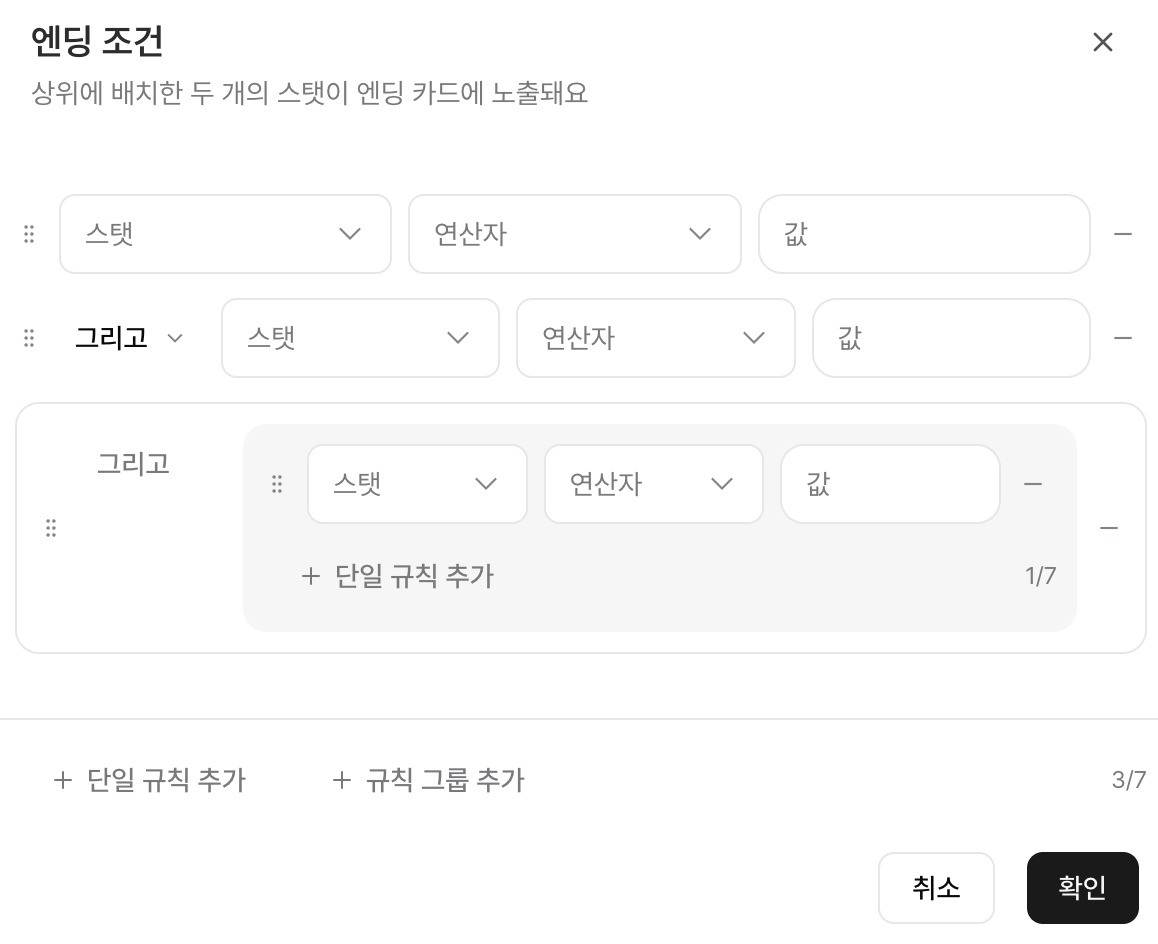 단일 규칙(스탯 + 연산자 + 값) 또는 규칙 그룹(AND/OR)을 활용할 수 있어요