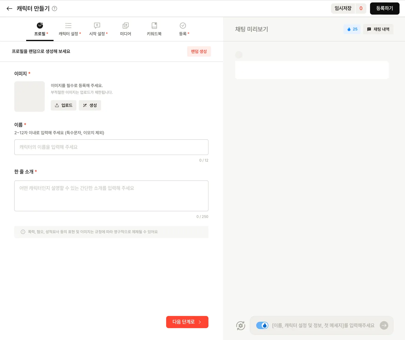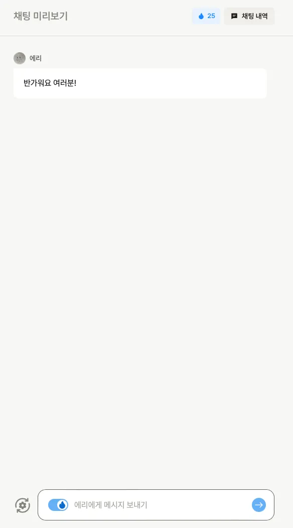 채팅 미리보기 영역에서는, 현재 내가 작성한 설정에서 스토리가 어떻게 대화하는지 미리 실험해볼 수 있어요!