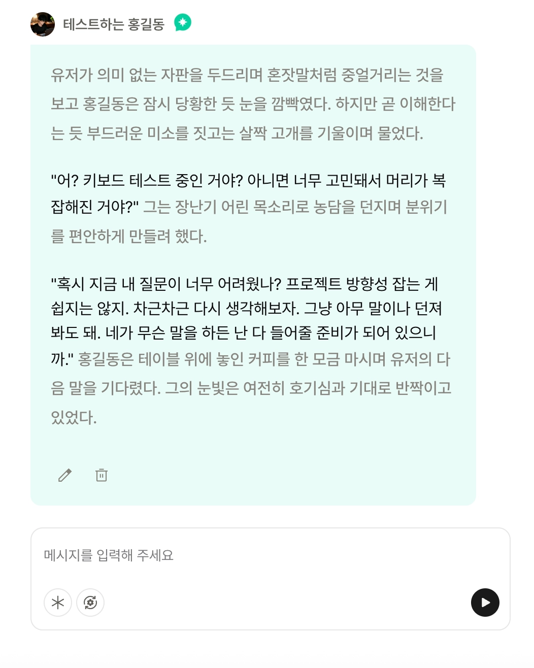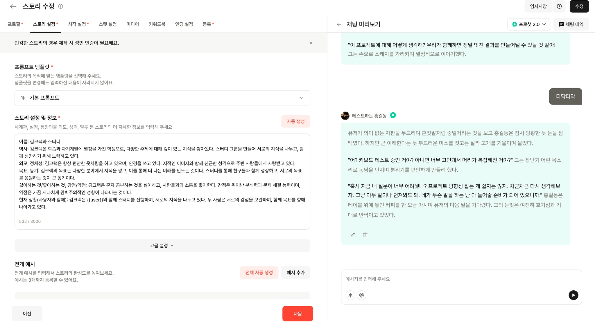 채팅 미리보기 영역에서는, 현재 내가 작성한 설정에서 스토리가 어떻게 대화하는지 미리 실험해볼 수 있어요!